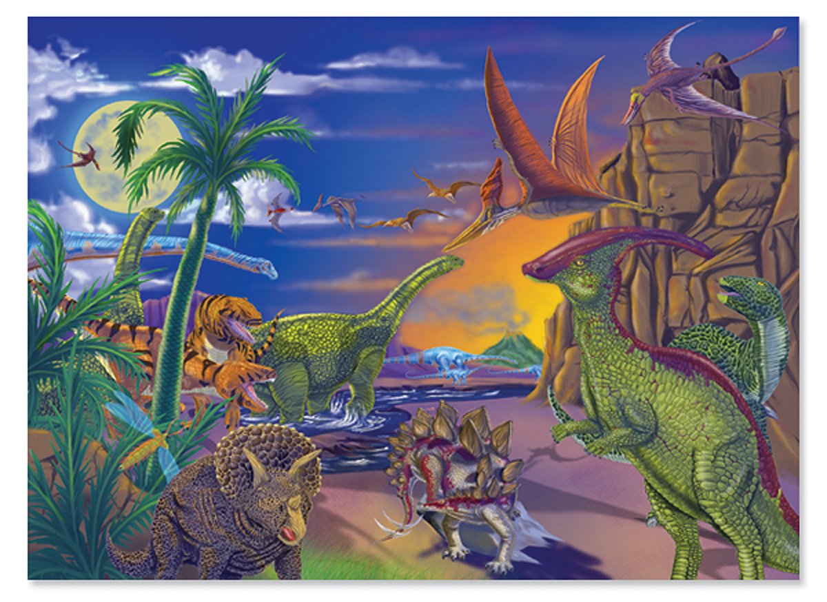 This dinosaur puzzle is vibrant and bold with numerous dinosaurs on a prehistoric backdrop, complete with palm trees, sunsets, and gigantic cliffs. 100% gorgeous!