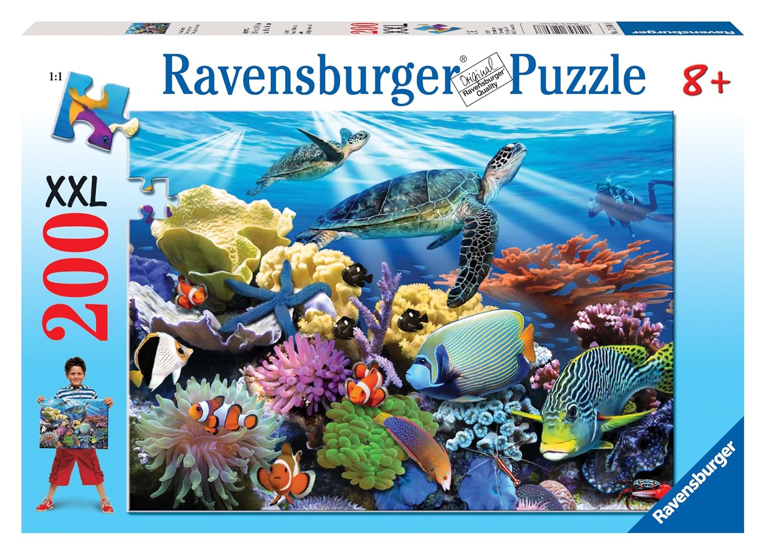 Another gorgeous jigsaw puzzle—this one is ocean-themed with featured pictures of sea turtles and all kinds of cool fish on a backdrop of sunlit water and a forefront of colorful coral.
